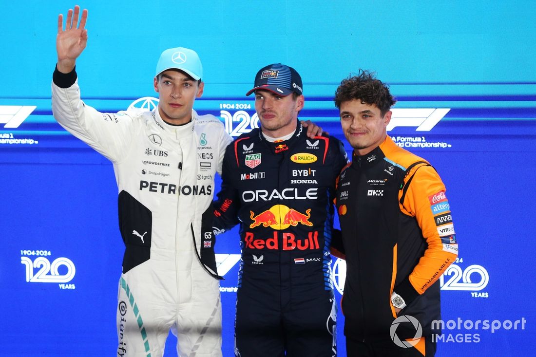 O homem da pole Max Verstappen, da Red Bull Racing, George Russell, da Mercedes-AMG F1 Team, e Lando Norris, da McLaren F1 Team, posam para fotografias no Parc Ferme