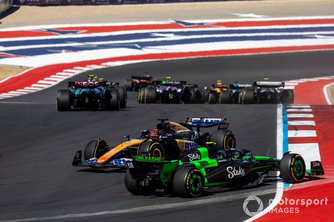 Lance Stroll, Aston Martin AMR24, passa ao lado de Esteban Ocon, Alpine A524, que roda e Franco Colapinto, Williams FW46, e Liam Lawson, RB F1 Team VCARB 01, passam
