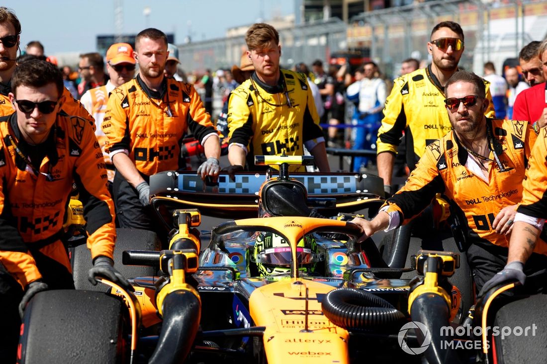 Os mecânicos empurram Lando Norris, McLaren MCL38, para a sua posição na grelha