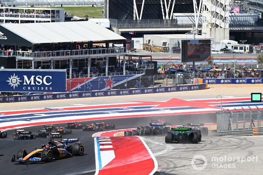 Lando Norris, McLaren MCL38, Max Verstappen, Red Bull Racing RB20, Charles Leclerc, Ferrari SF-24, Carlos Sainz, Ferrari SF-24, Oscar Piastri, McLaren MCL38, Pierre Gasly, Alpine A524, Fernando Alonso, Aston Martin AMR24, o resto do pelotão a
