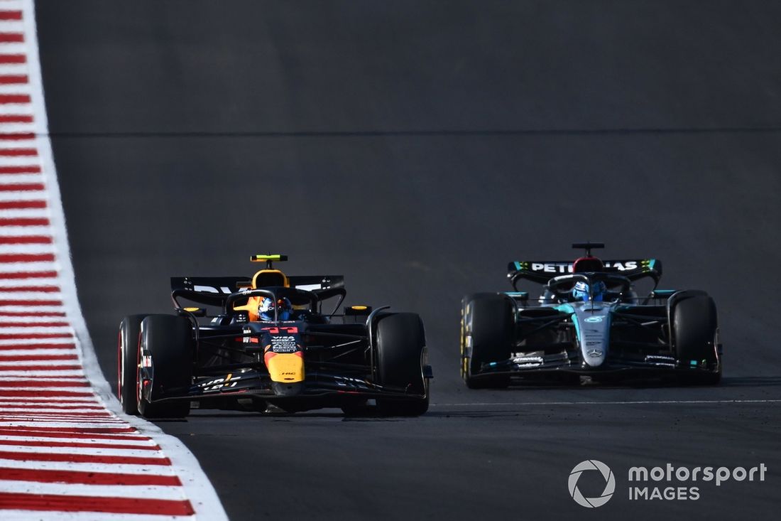 Sergio Perez, Red Bull Racing RB20, George Russell, Mercedes F1 W15