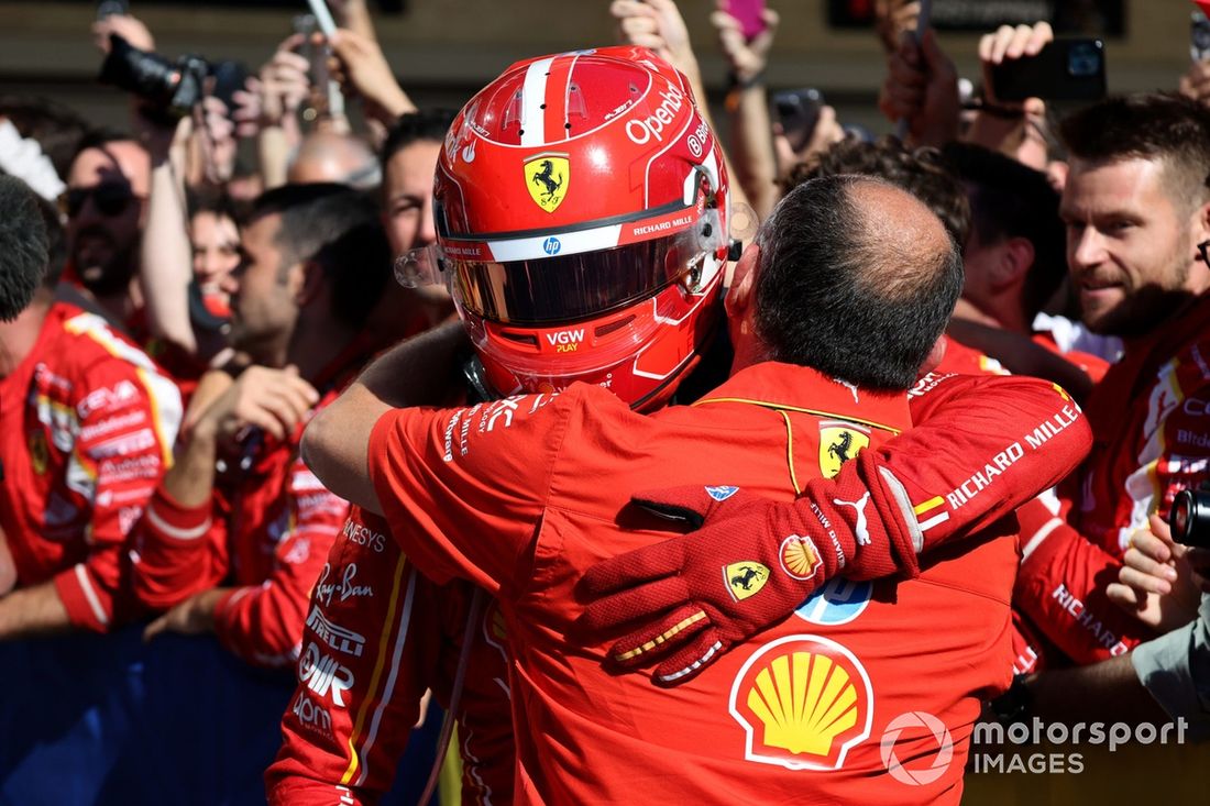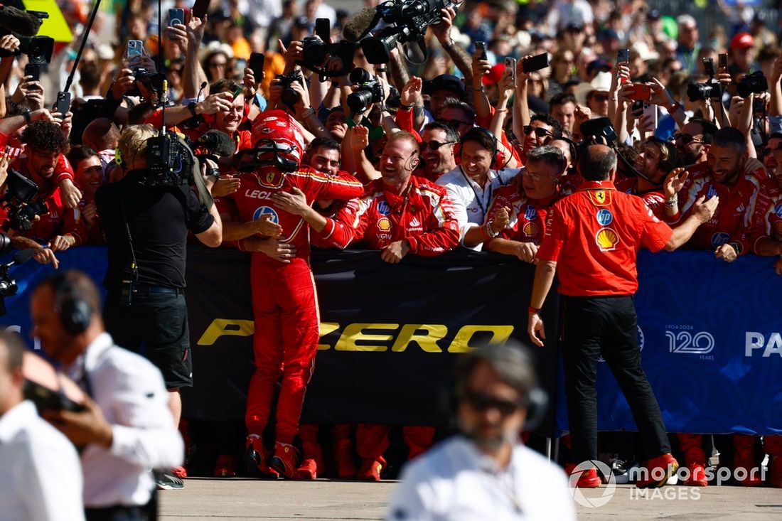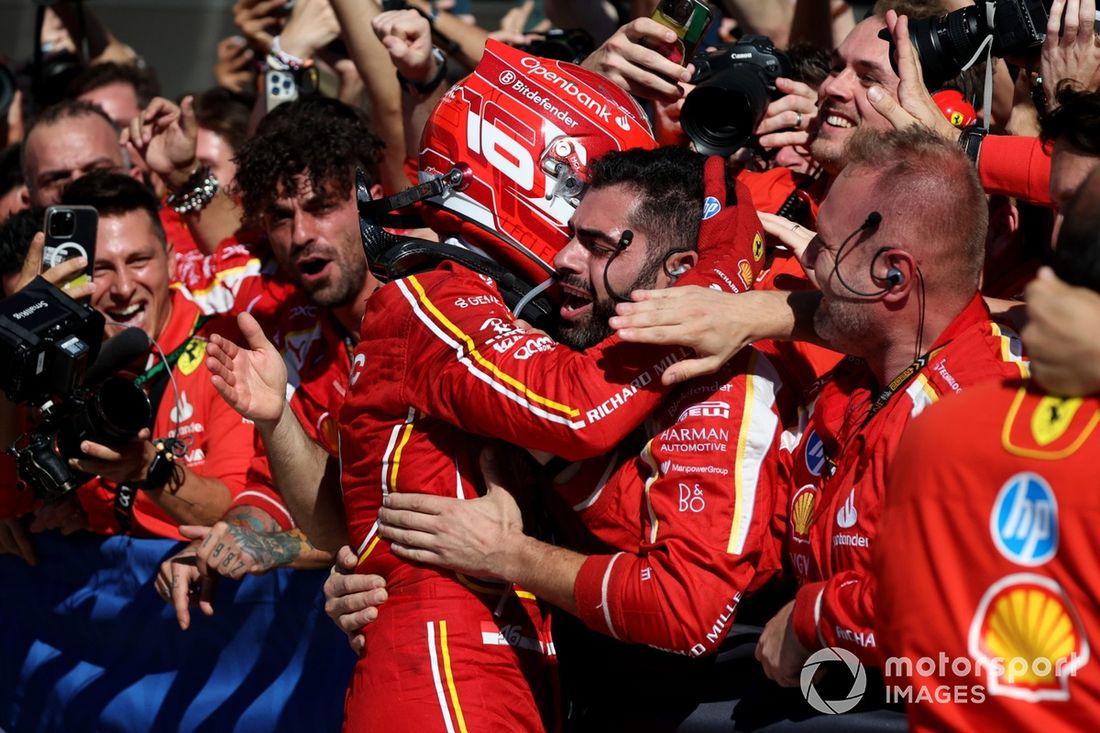 Charles Leclerc, Scuderia Ferrari, 1ª posição, festeja com a sua equipa no Parc Ferme