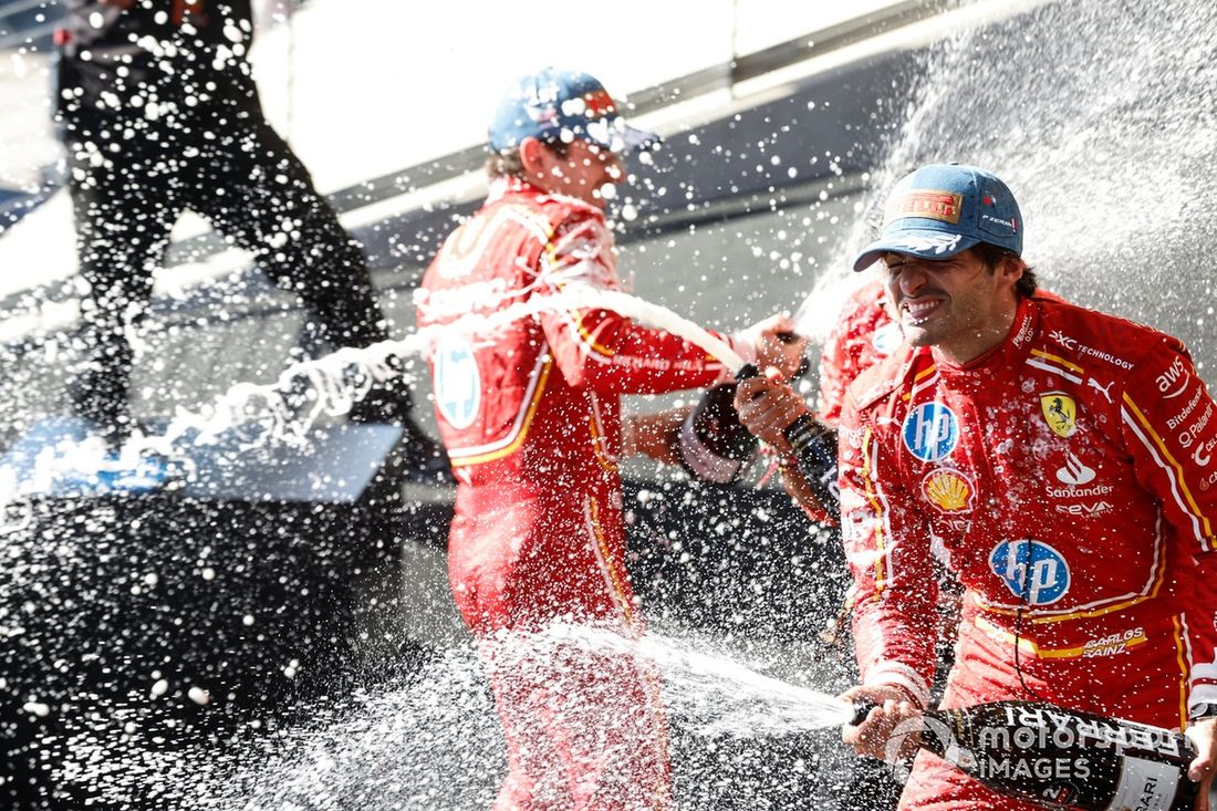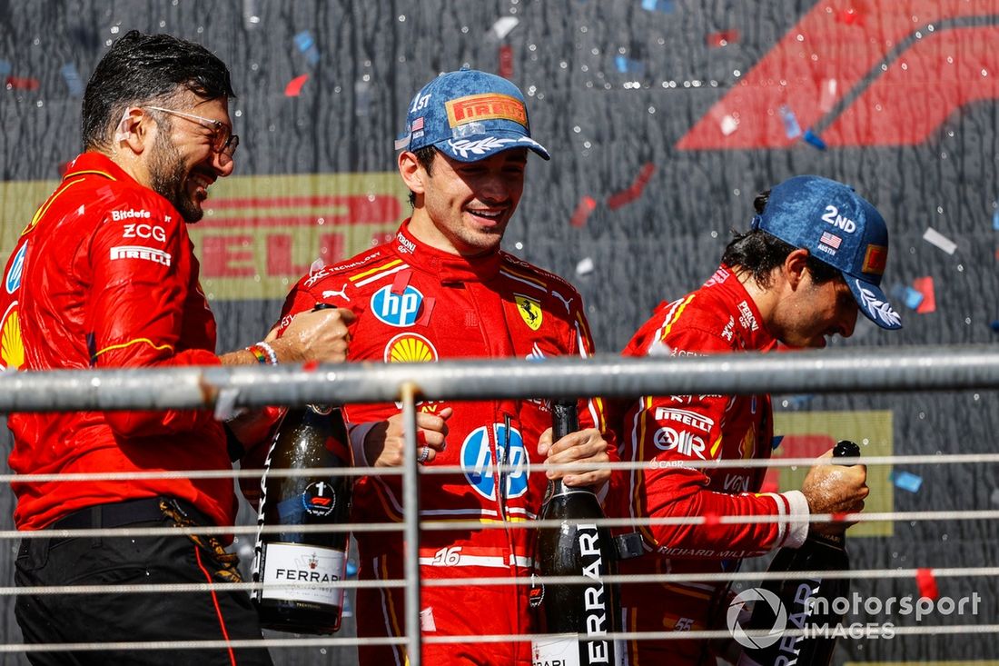 Charles Leclerc, Scuderia Ferrari, 1ª posição, Carlos Sainz, Scuderia Ferrari, 2ª posição, festejam no pódio com champanhe