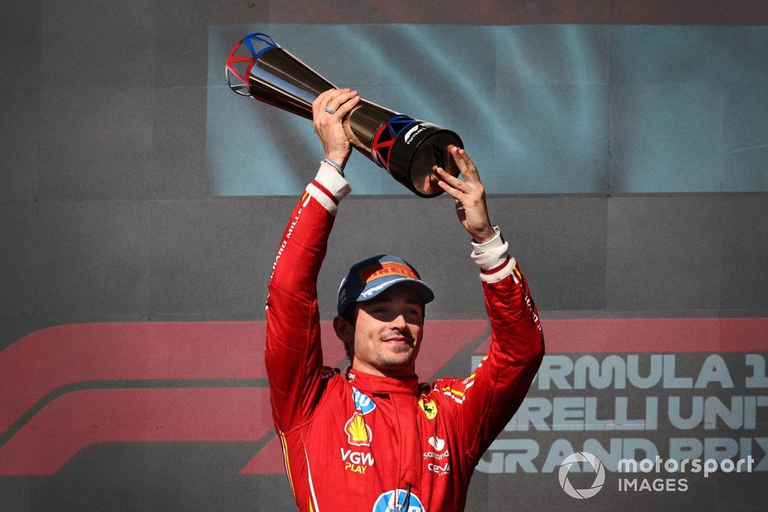 Charles Leclerc, Scuderia Ferrari, 1º classificado, levanta o troféu para festejar