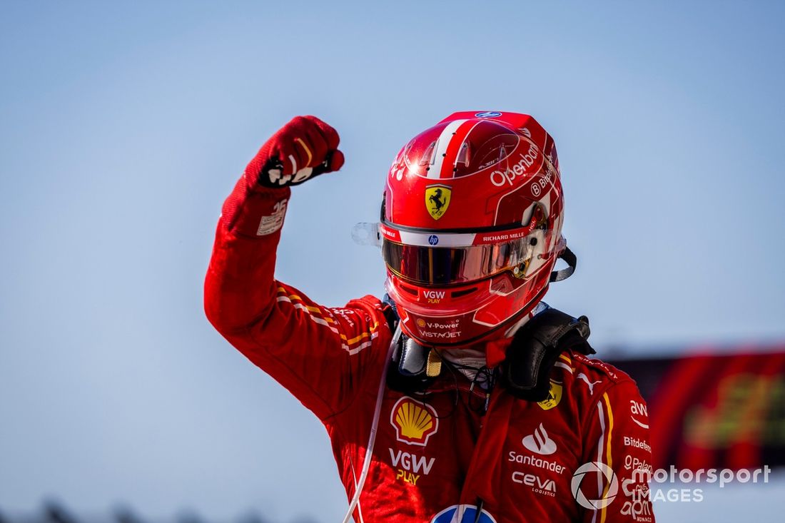 Charles Leclerc, Scuderia Ferrari, 1ª posição, festeja à chegada ao Parc Ferme