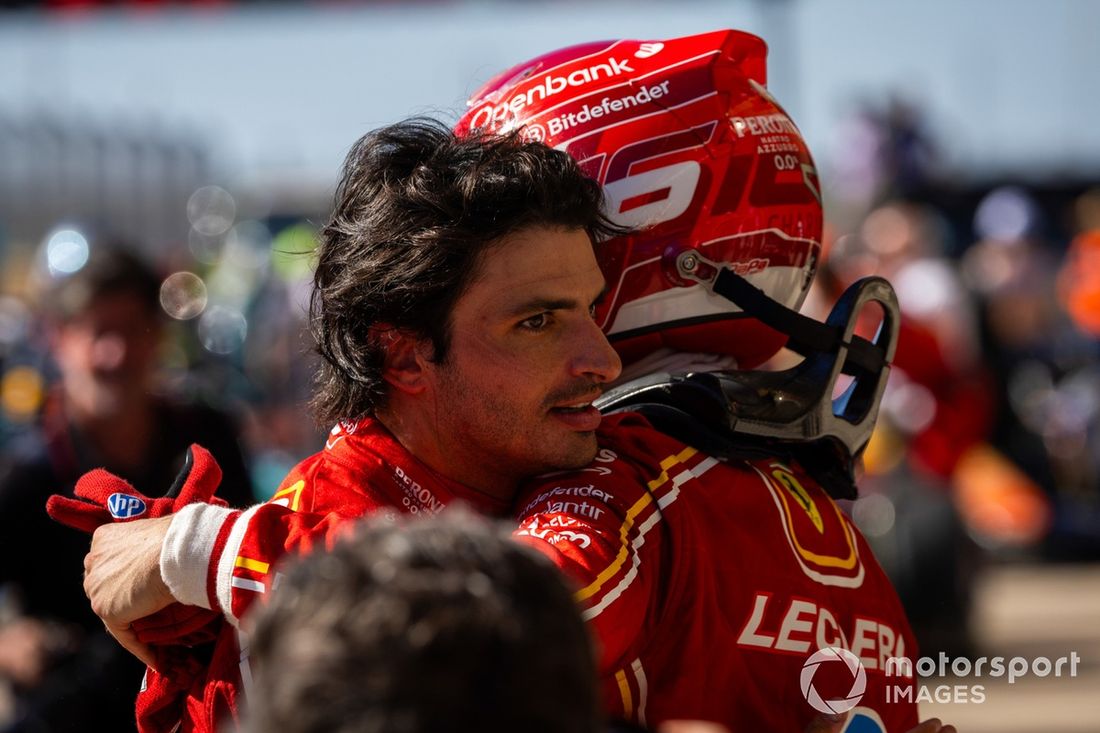 Charles Leclerc, Scuderia Ferrari, 1ª posição, Carlos Sainz, Scuderia Ferrari, 2ª posição, felicitam-se mutuamente no Parc Ferme