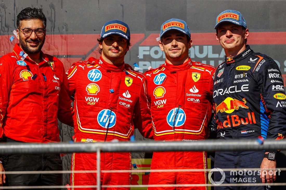 Charles Leclerc, Scuderia Ferrari, 1ª posição, Carlos Sainz, Scuderia Ferrari, 2ª posição, Max Verstappen, Red Bull Racing, 3ª posição, no pódio