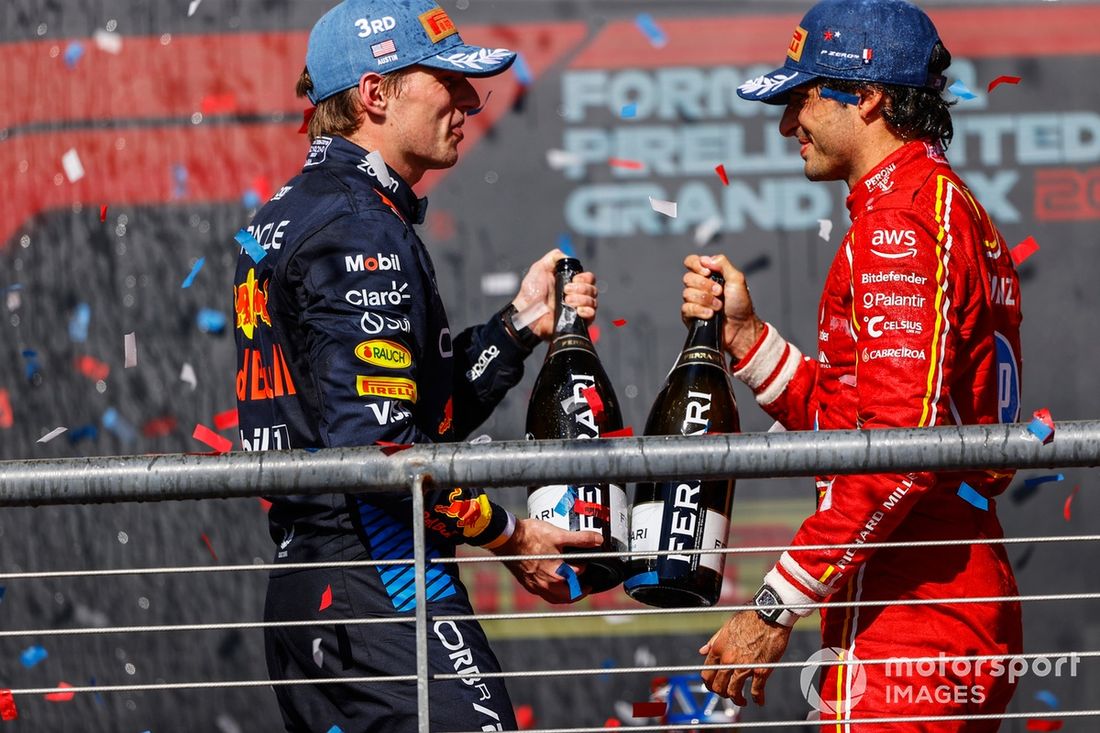 Max Verstappen, Red Bull Racing, 3º classificado, Carlos Sainz, Scuderia Ferrari, 2º classificado, aplaudem com as suas garrafas de champanhe no pódio