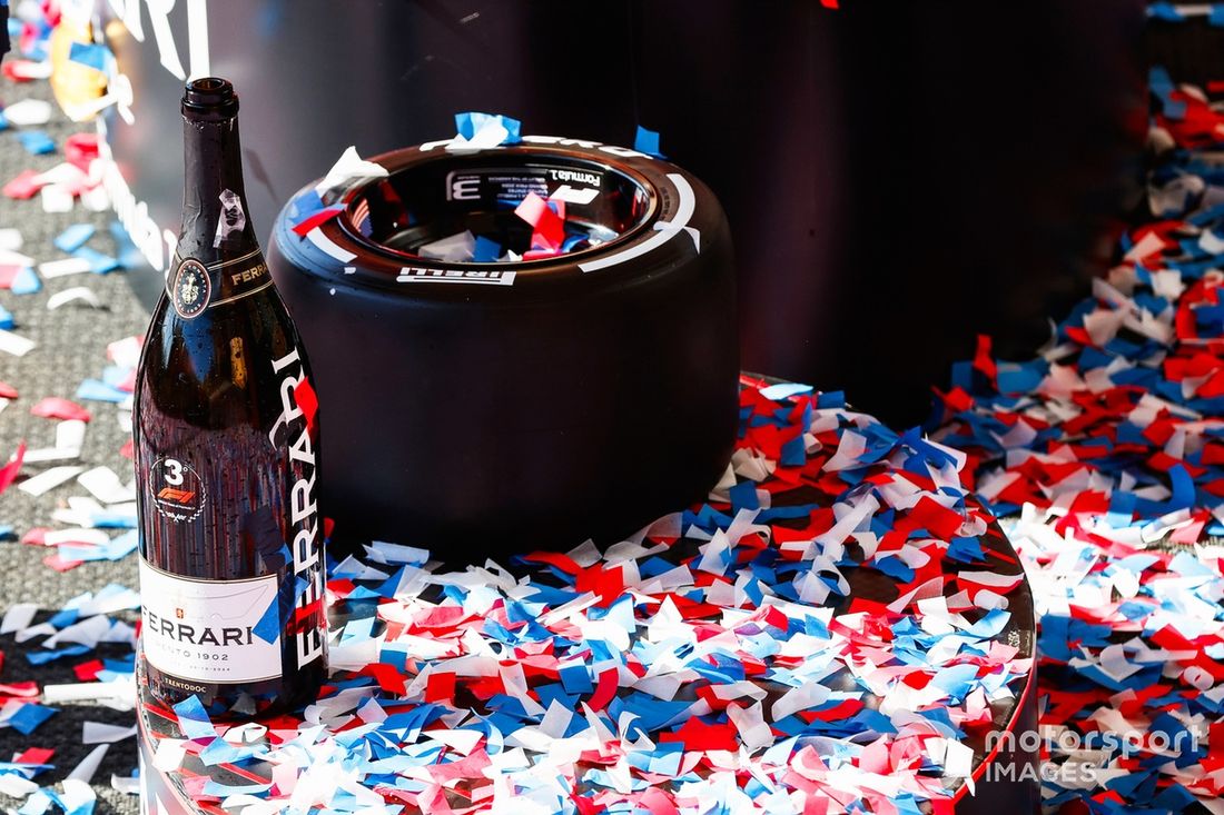 Charles Leclerc, Scuderia Ferrari, 1ª posição, festeja no pódio com champanhe