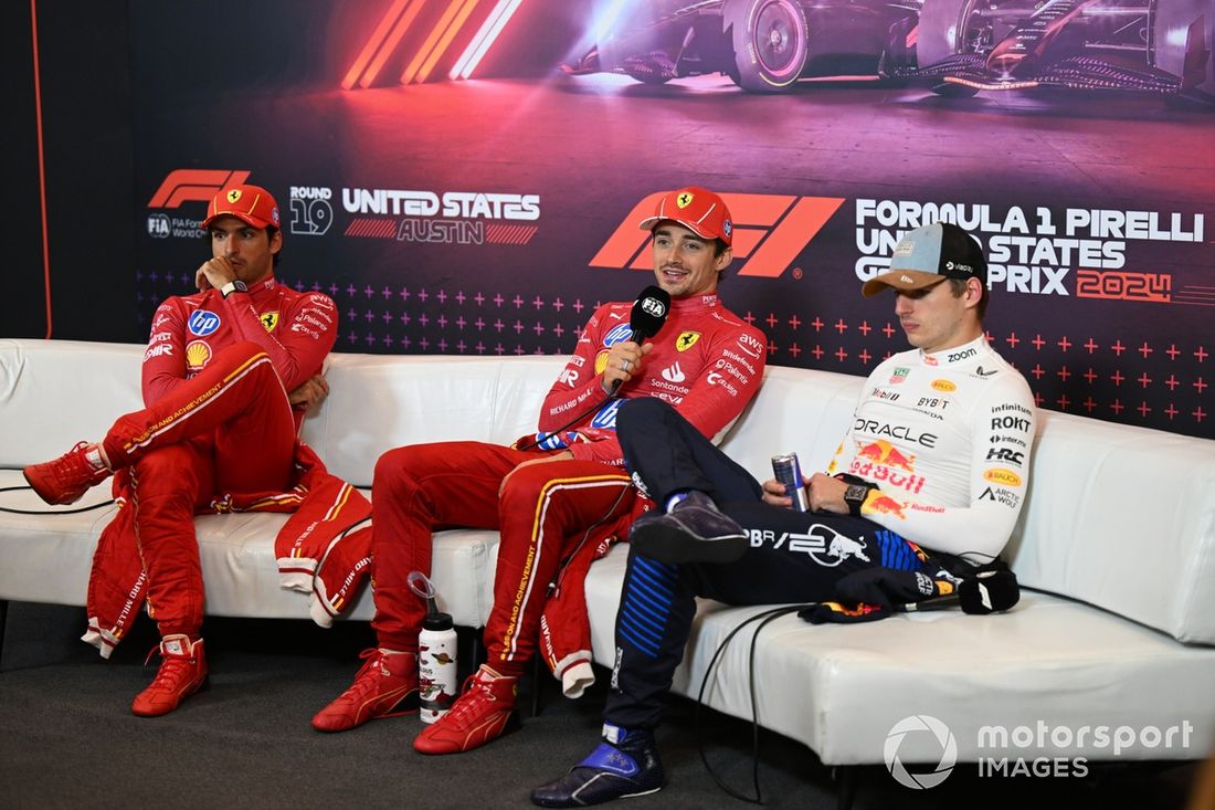 Charles Leclerc, Scuderia Ferrari, 1ª posição, Carlos Sainz, Scuderia Ferrari, 2ª posição, Max Verstappen, Red Bull Racing, 3ª posição, na conferência de imprensa após a corrida