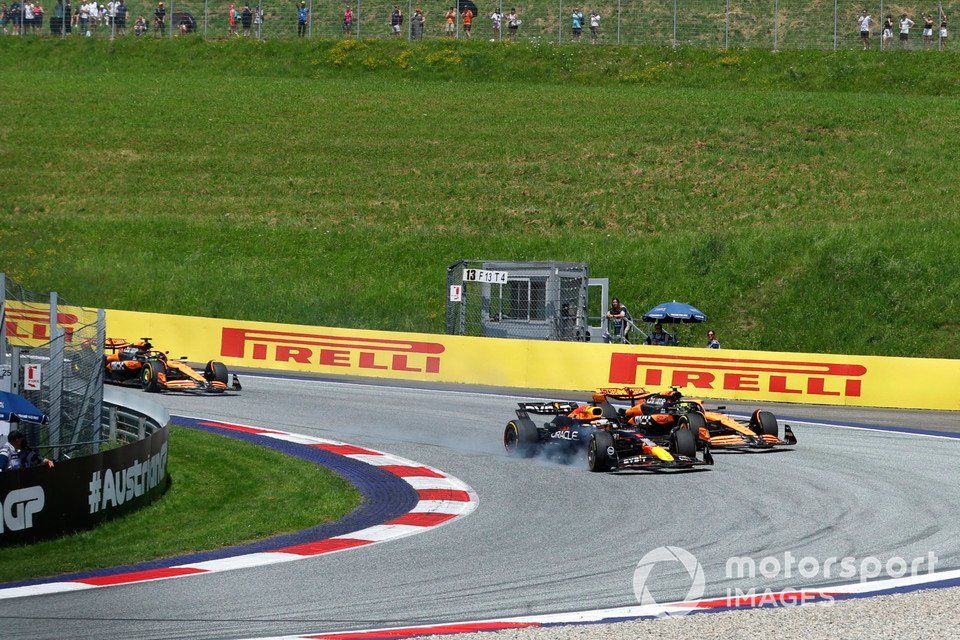 Max Verstappen, Red Bull Racing RB20, trava com Lando Norris, McLaren MCL38, logo atrás