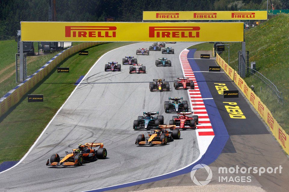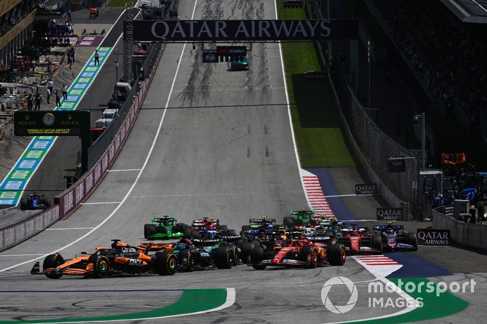 Max Verstappen, Red Bull Racing RB20, Lando Norris, McLaren MCL38, Oscar Piastri, McLaren MCL38, o resto do pelotão no início do Sprint