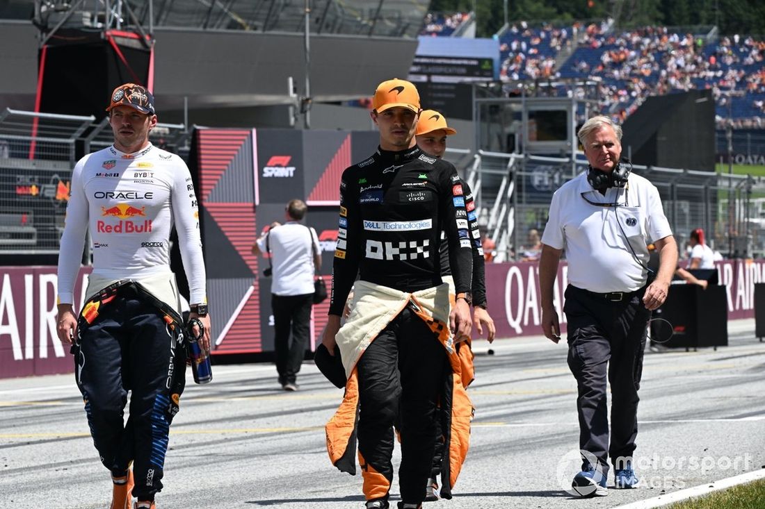 Oscar Piastri, da McLaren F1 Team, fala com o vencedor do Sprint, Max Verstappen, da Red Bull Racing, na grelha de partida