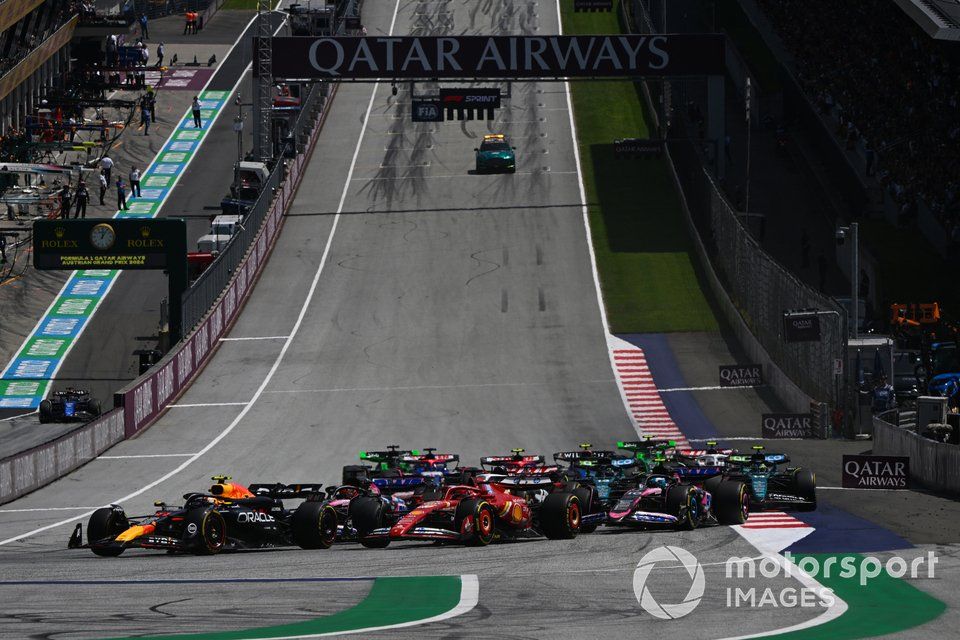 Sergio Perez, Red Bull Racing RB20, Charles Leclerc, Ferrari SF-24, Esteban Ocon, Alpine A524, o resto do pelotão no início da Sprint