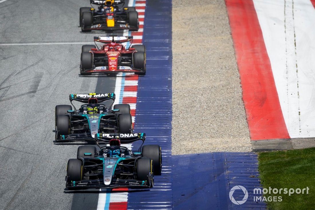 George Russell, Mercedes F1 W15, Lewis Hamilton, Mercedes F1 W15, Charles Leclerc, Ferrari SF-24, Sergio Perez, Red Bull Racing RB20