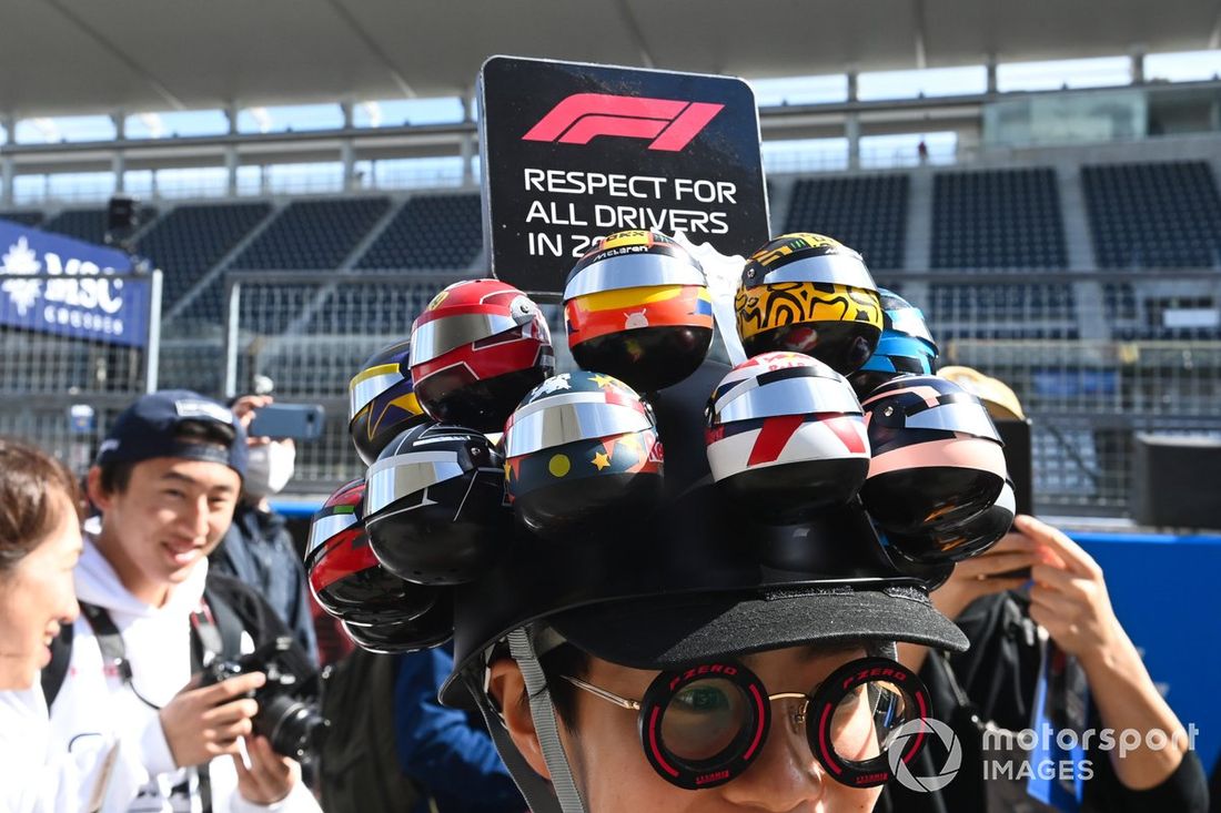 Um adepto com um boné com os capacetes dos pilotos nas boxes