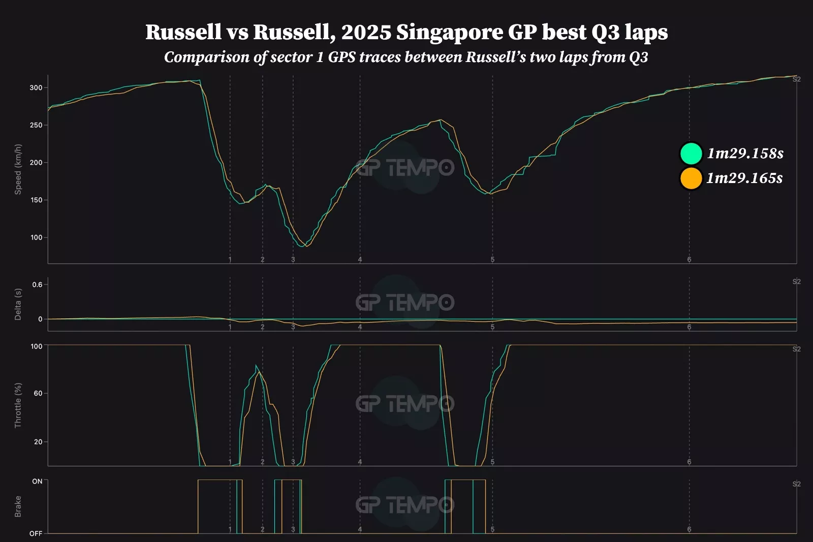 Os dados do GPS são interessantes de ler. Russell parecia um pouco mais hesitante no primeiro setor (na parte inicial) durante a segunda tentativa (linha verde-azulada) em comparação com com os traços da primeira volta no Q3 (linha amarela). Ele freou um pouco mais cedo em cada curva nessa parte inicial da volta, mas reduziu a potência um pouco mais cedo.