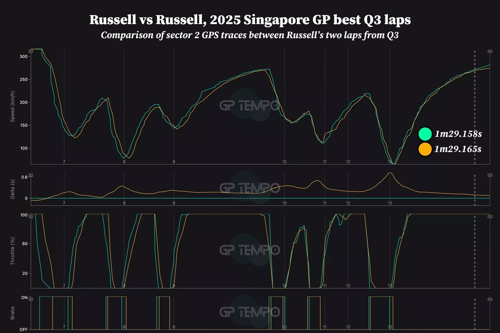 O cenário foi semelhante ao da Curva 5, onde ele adotou uma postura de frenagem mais precoce e foi um pouco mais lento na fase de curvas, mas atingindo o pico superior um pouco mais cedo sob aceleração. No final do primeiro setor, do Raffles Boulevard até a curva 7, ele estava 0s06 abaixo de seu melhor tempo anterior.