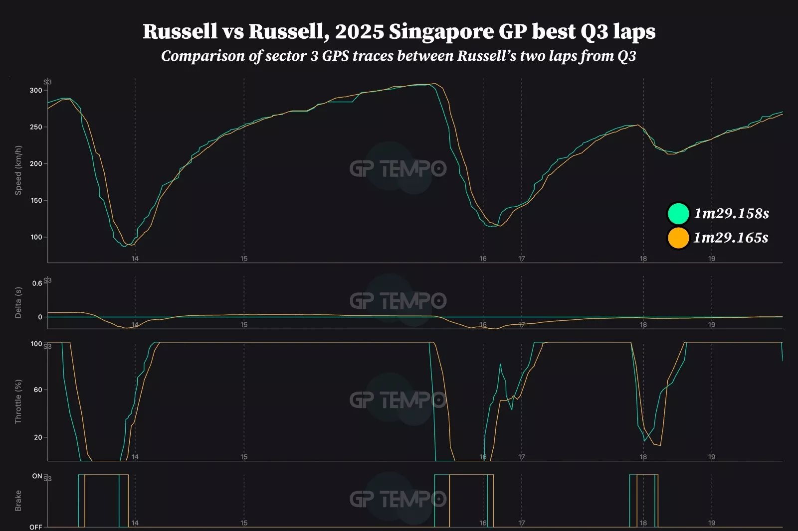 Embora o delta na saída da curva 17 estivesse baixo, a manutenção da velocidade de saída lhe deu um pouco mais de impulso para a frente para atacar a última curva dupla à esquerda. A chave para isso foi Russell ter deixado cerca de 4 a 5% a mais de aceleração no ponto mais lento da entrada, garantindo que ele tivesse aceleração suficiente para recuperar a margem de 0s007 de diferença.