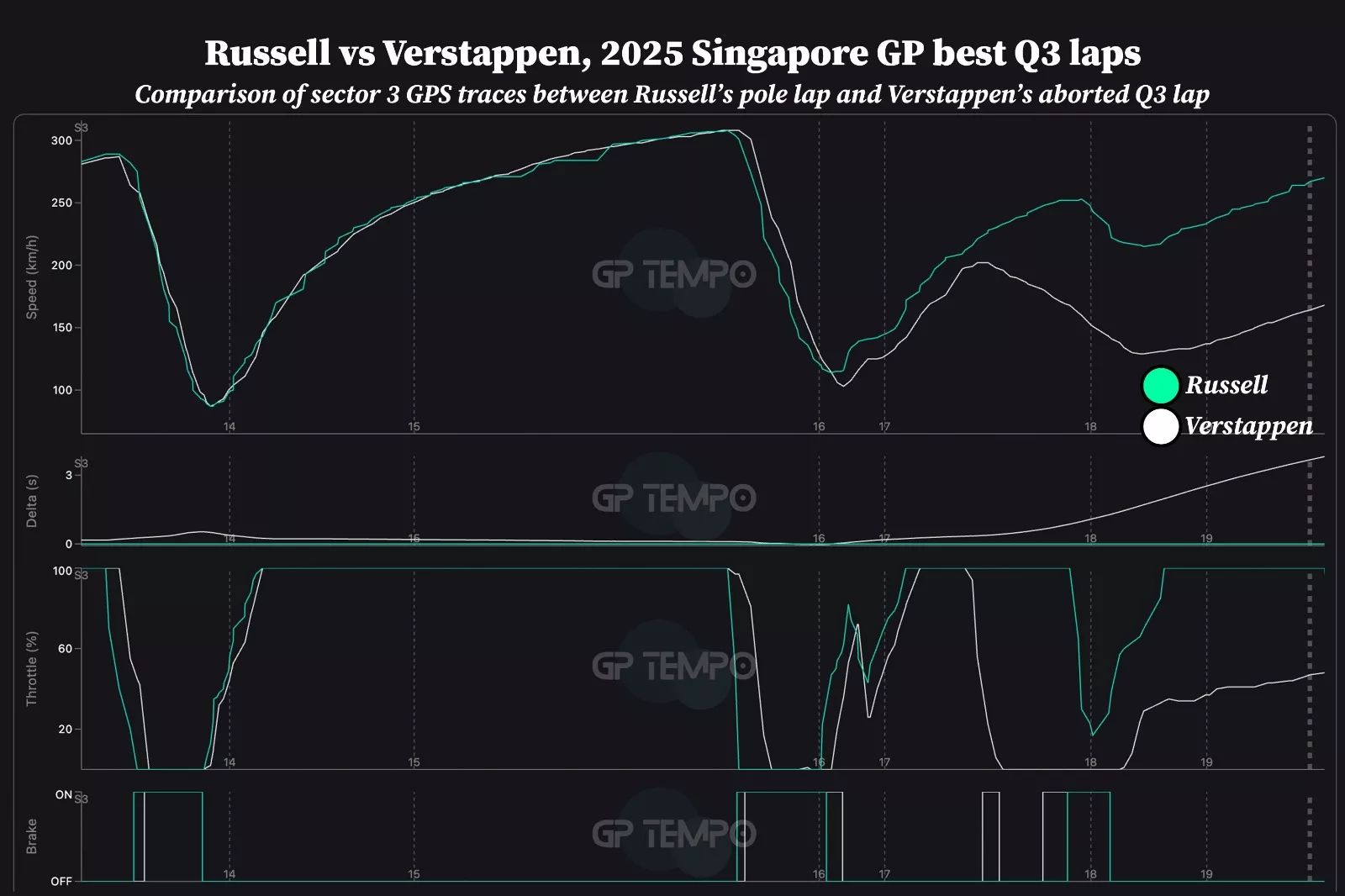 Verstappen freou mais tarde do que Russell na curva 16. Assim, ele acabou saindo um pouco fora de linha e acabou tendo que compensar mais na Curva 17, pois errou o ápice. Sua velocidade mínima na Curva 16 foi cerca de 10 km/h menor do que a de Russell, pois ele teve de frear um pouco mais para manter o carro entre as linhas brancas, e pegou mais lombadas na Curva 17 do que gostaria.